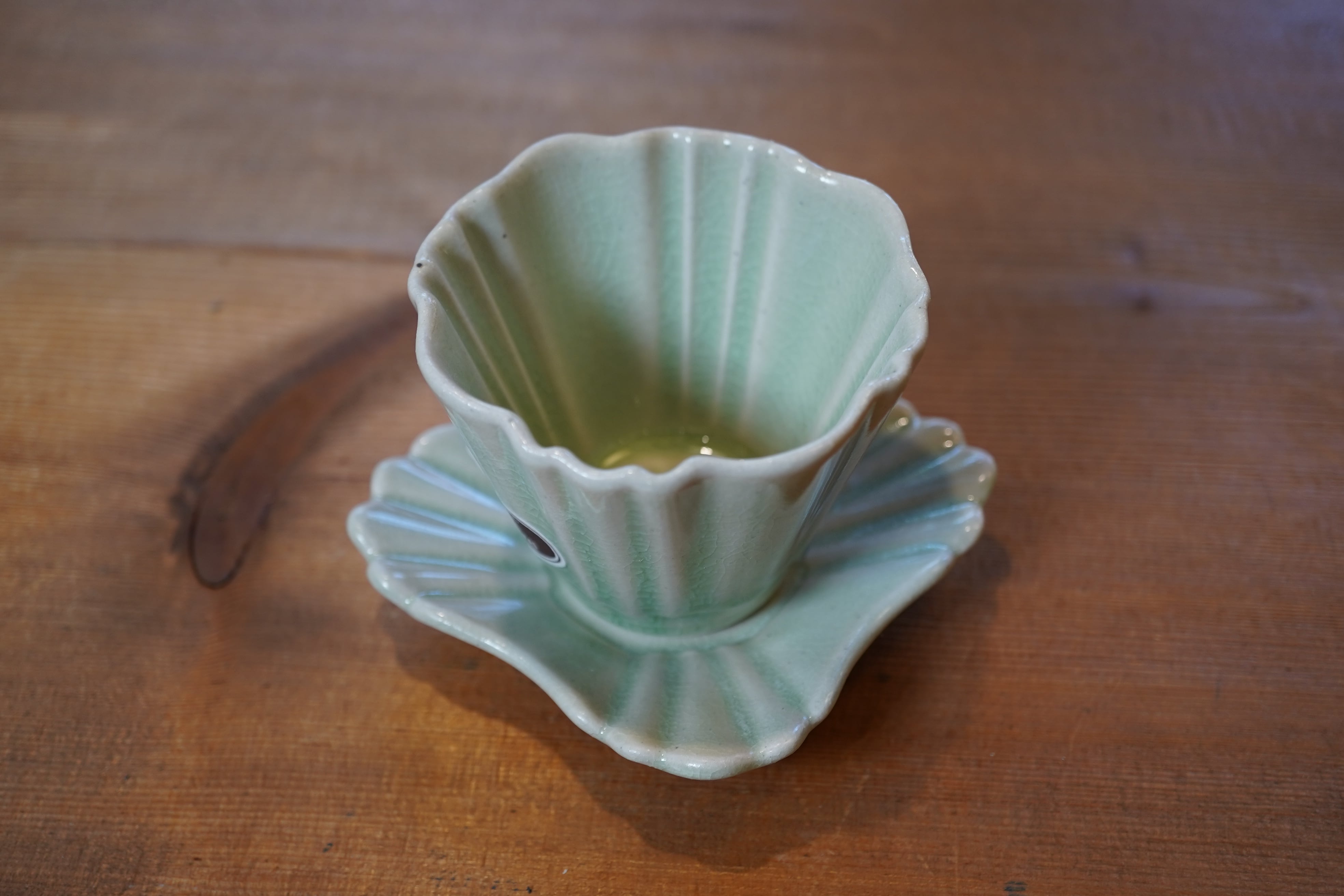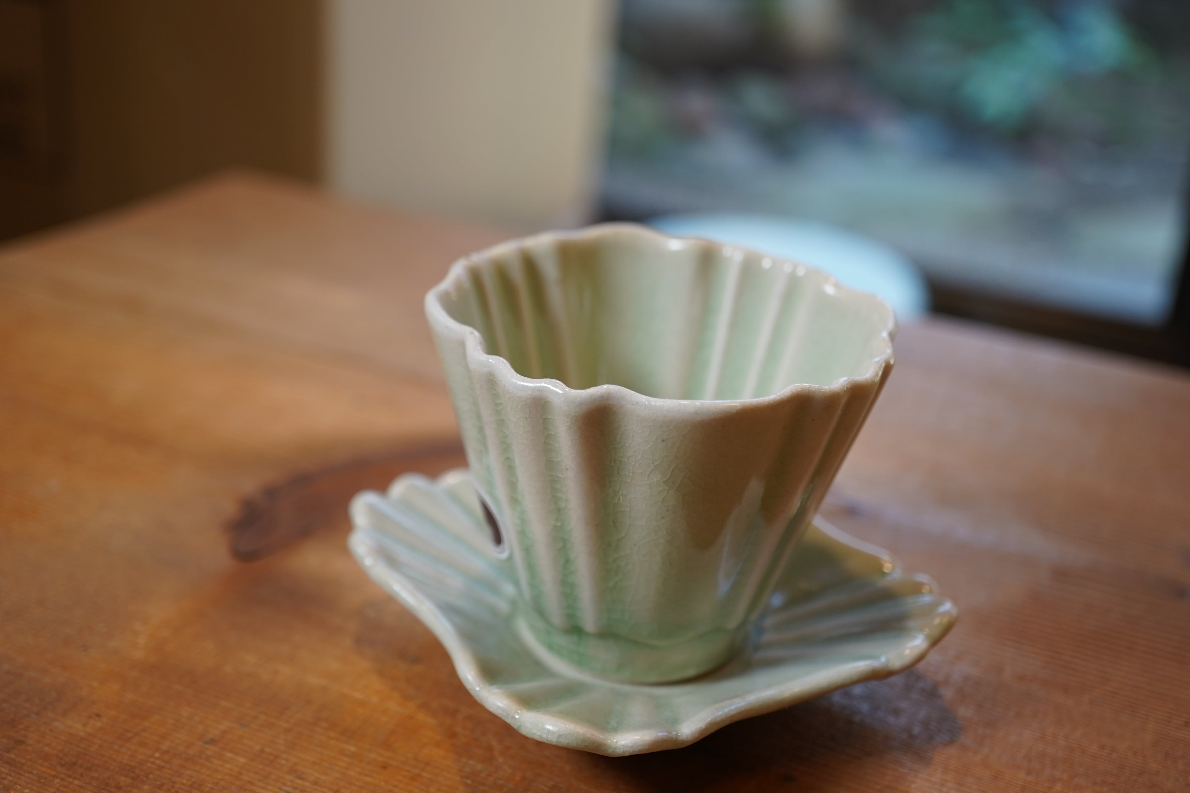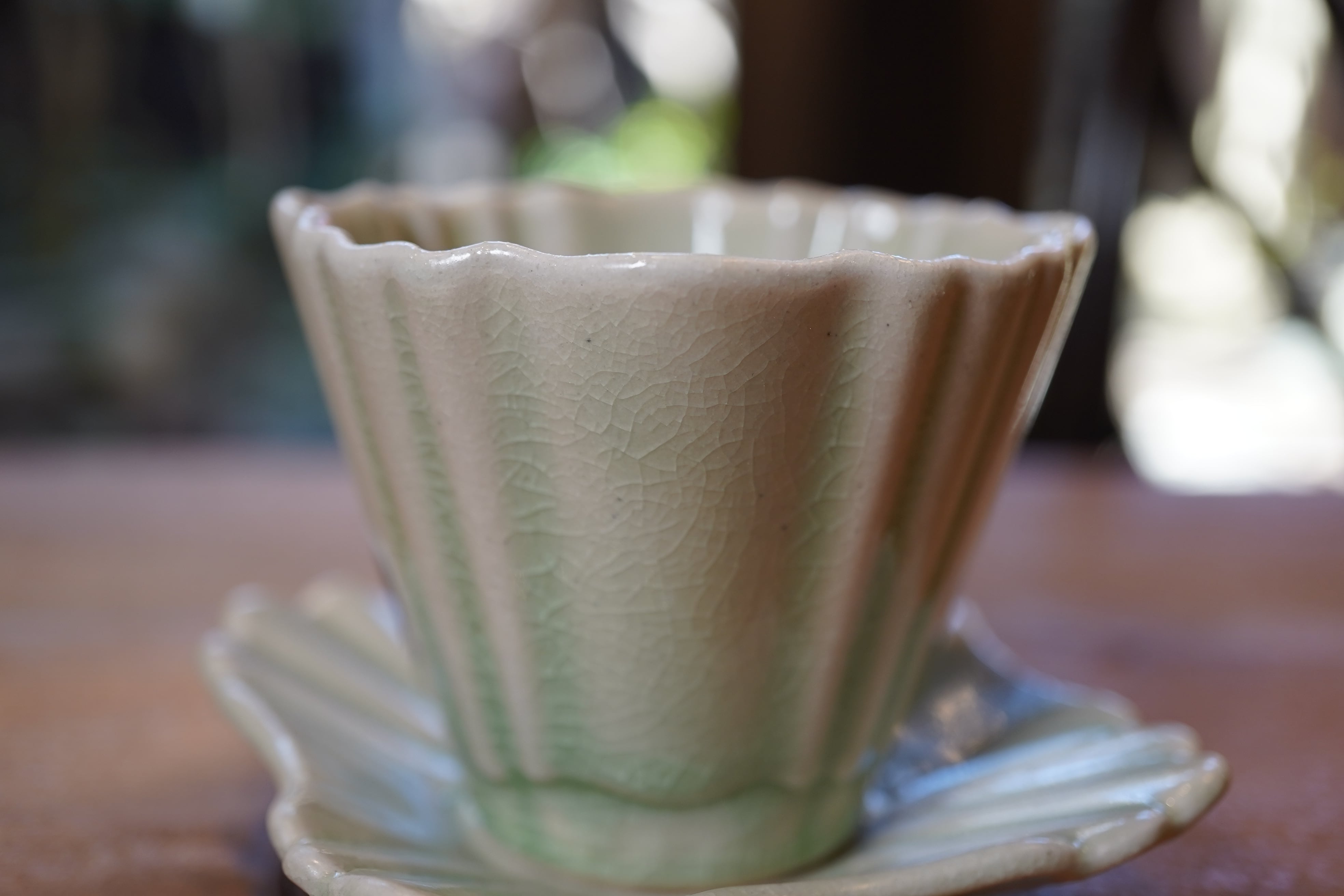 湯呑みは、満水で約110ccの小ぶりなサイズ。一煎目から三煎目まで、お茶の色・香り・味の変化をじっくり楽しめます。縦のラインと柔らかな曲線を組み合わせたフォルムは、影の落ち方まで美しく、口元は薄く仕上げて、口当たりもなめらかに。