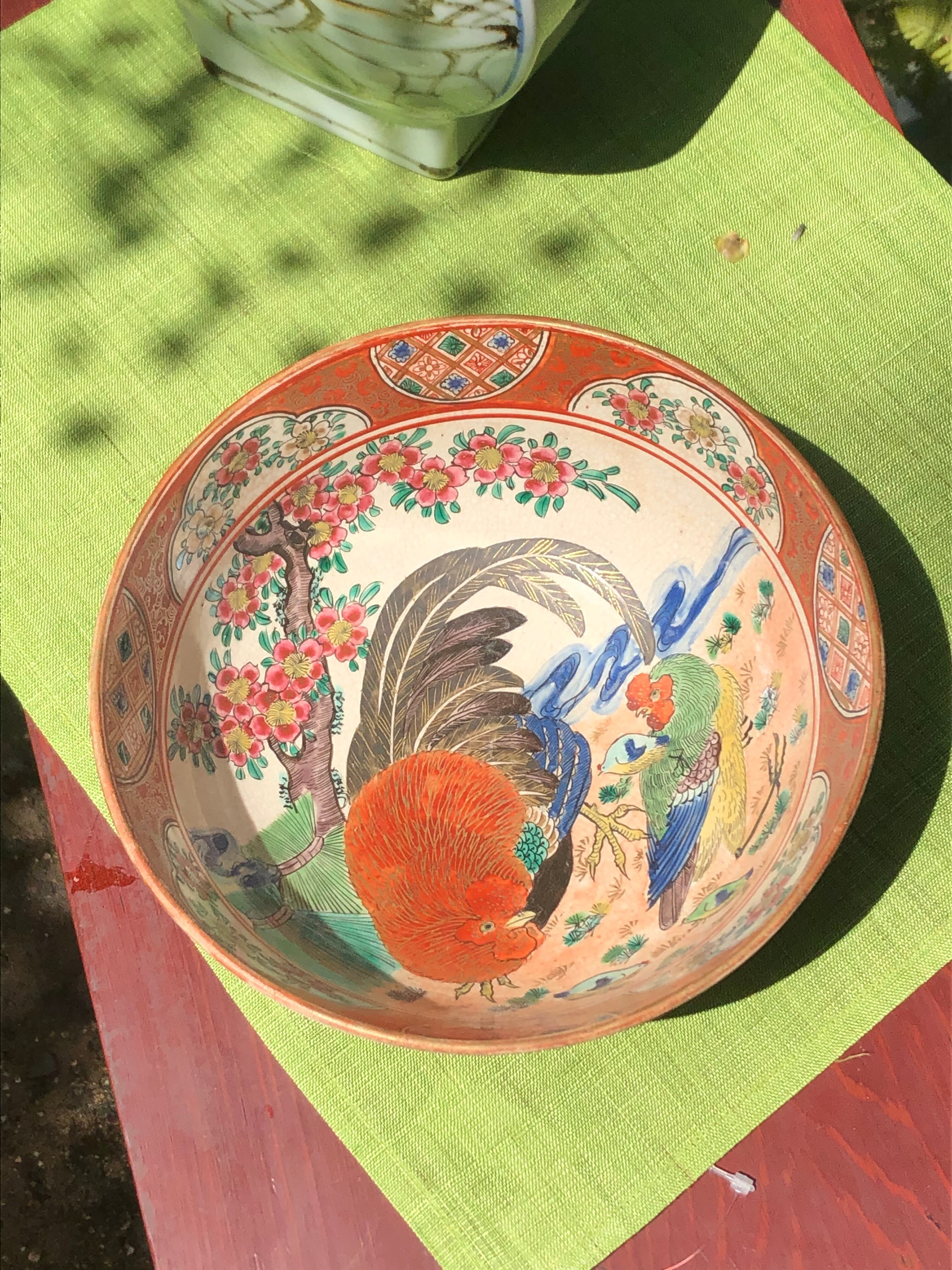 狩野派を思わせる彩り豊かなで写実的な雄鶏と雌鳥、植物が細かな柄で蜜に描かれ、大変豪華な器です。