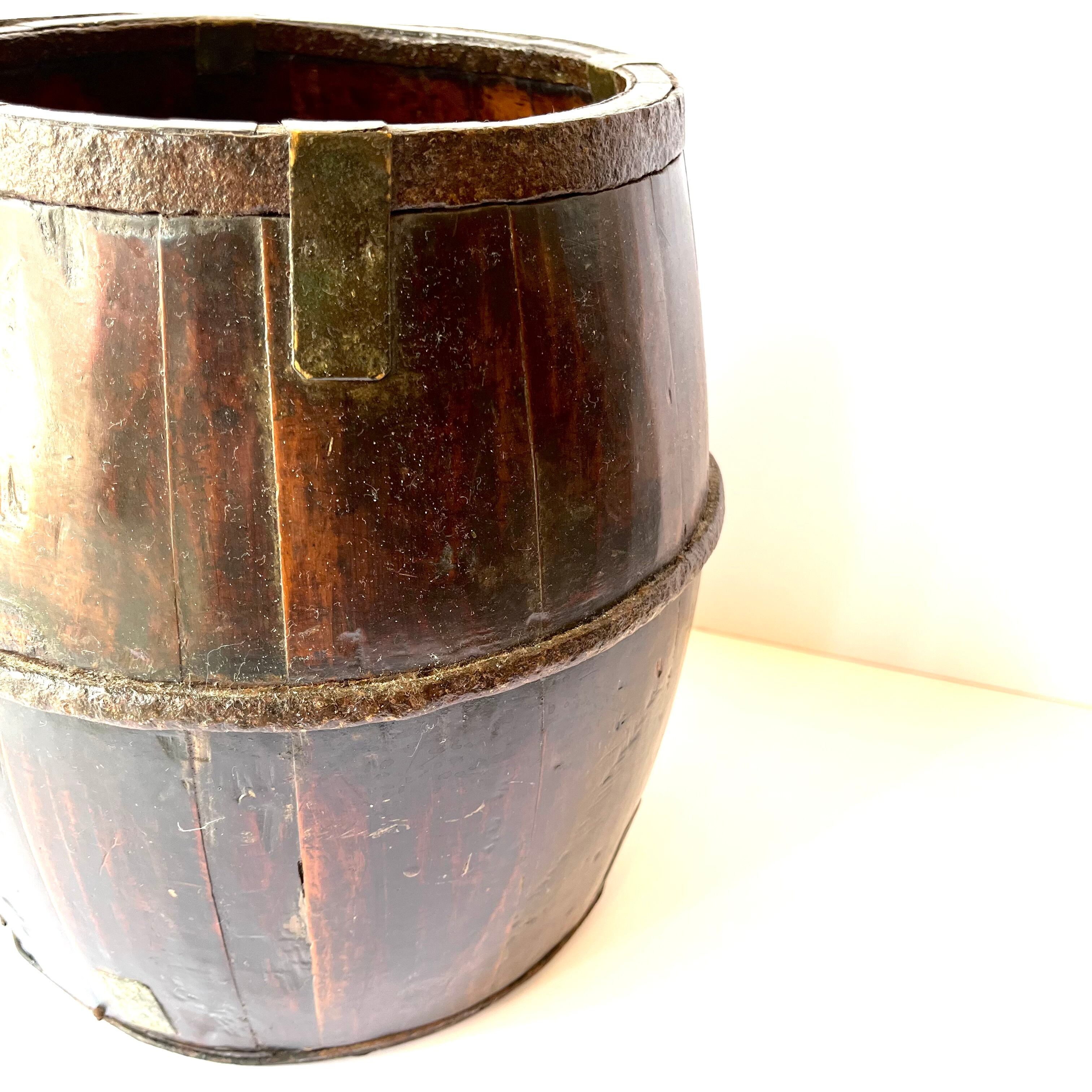 ・アンティーク物の桶です。年代や使用されている木の種類は分かりませんが、とても艶が出ていて素敵なアンティークの雰囲気が出ています。お花を活けたり、小物入れたり、使い道は沢山ありそうです。