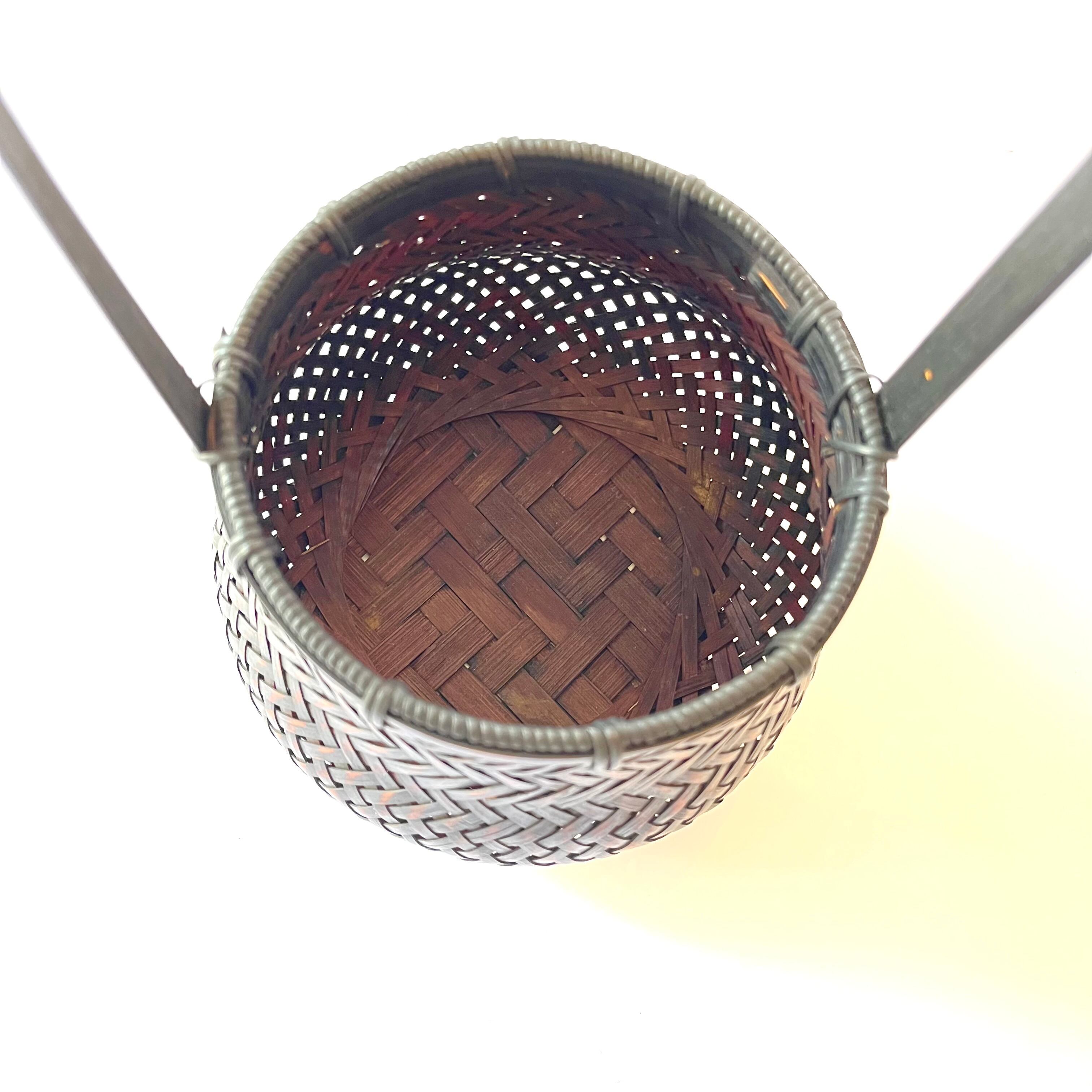 ・アンティーク物の竹籠です。年代は分かりませんが、竹の艶が出ていて素敵なアンティークの雰囲気が出ています。お花を活けたり、小物入れたり、使い道は沢山ありそうです。